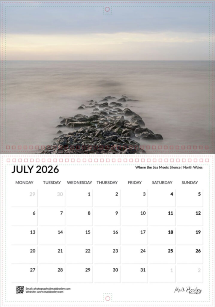 This year’s calendar has been a real pleasure to create, featuring a collection of images captured across the UK, along with a few special additions from Fuerteventura and Corsica. One of my personal favourites appears in July, a serene seascape titled “Where the Sea Meets Silence.”
